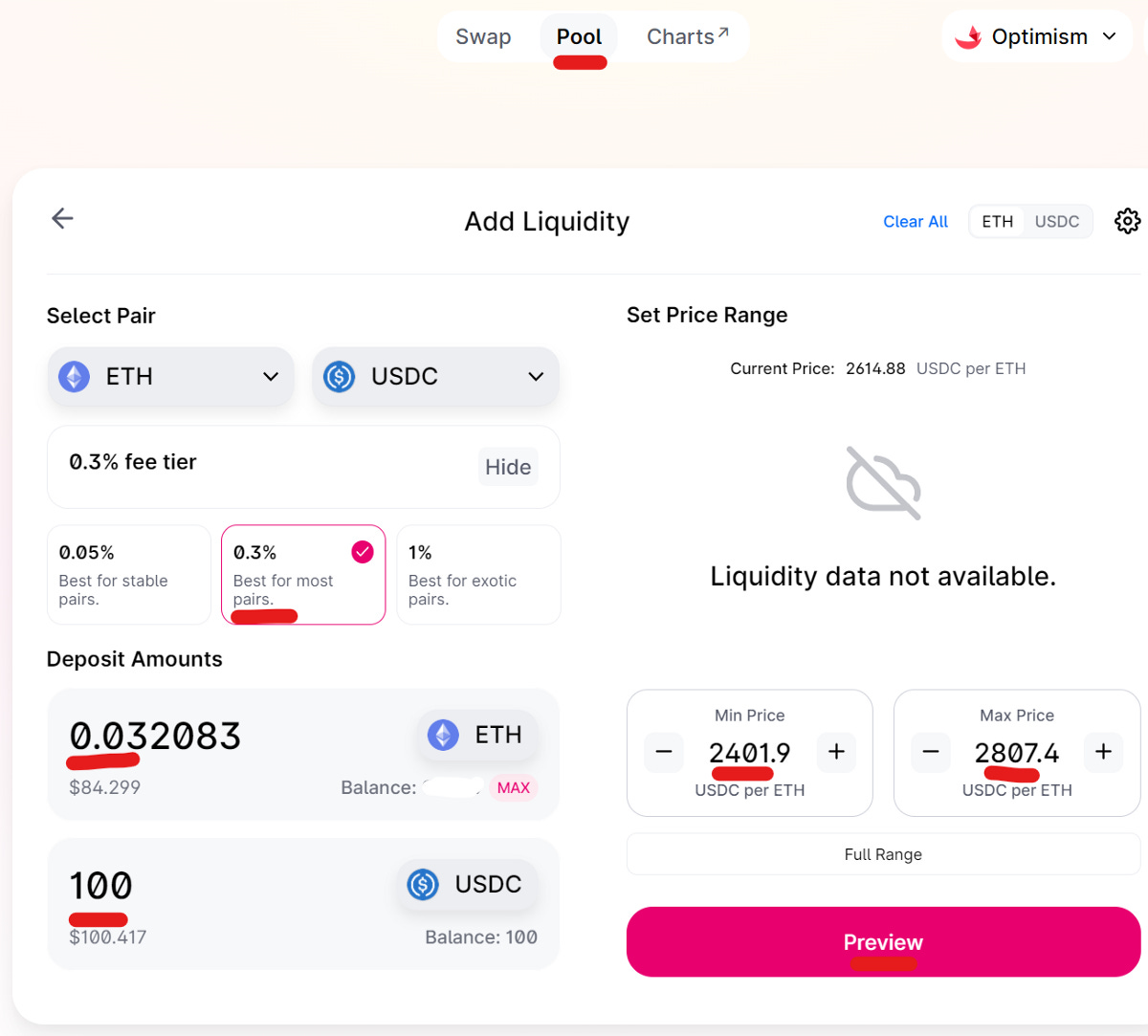 Go to https://app.uniswap.org. Choose your network and select “Pool”. Select your tokens to pair, trading fees, deposit amount and the upper/lower bound of your LP. (If you are not familiar with how Uniswap V3 works, read here for a detailed guide.)