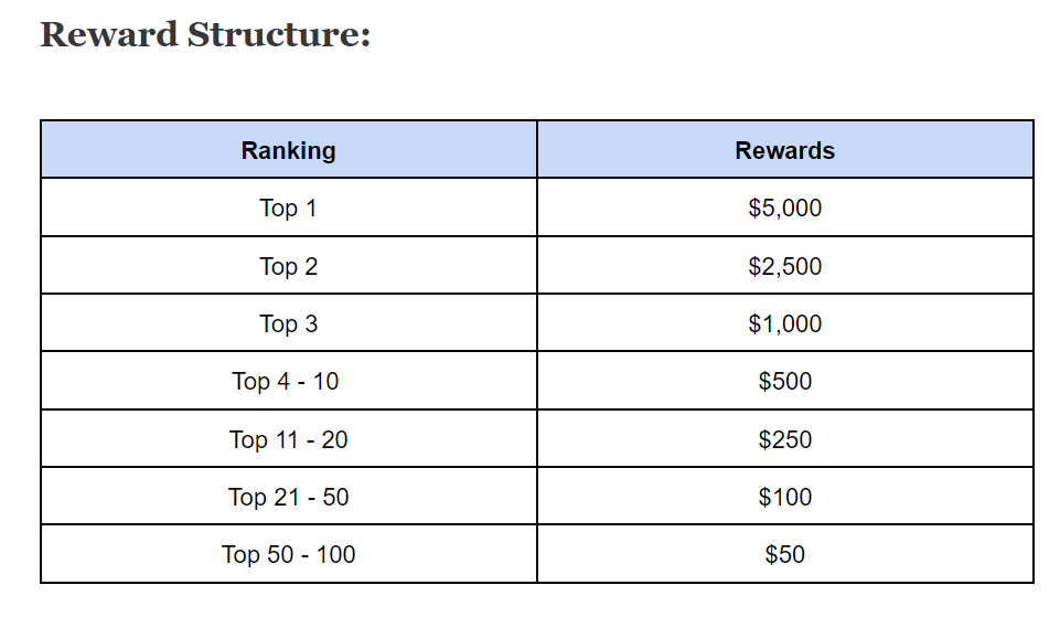 The top 100 addresses with the highest trading volume during the competition period (01:30 PM, Dec 28, 2021–05:00 PM, Jan 25, 2022 UTC) will share a pool of 20,000 USDC.
