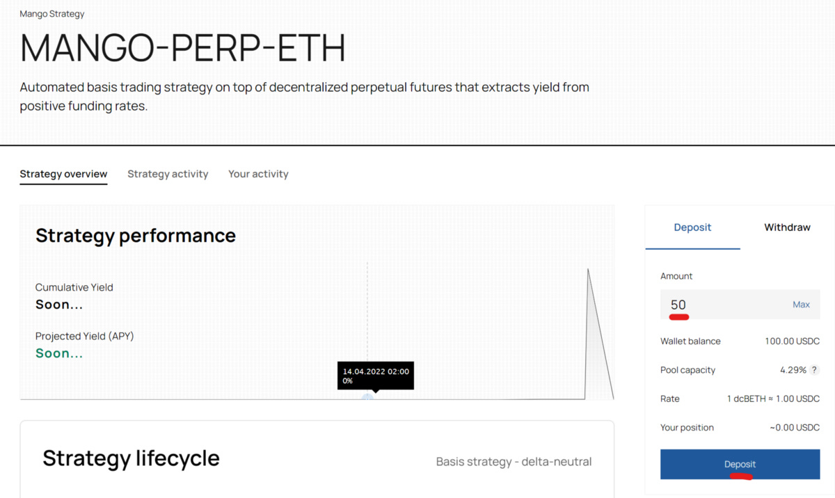 Head to DeCommas Automated Vault using https://app.decommas.io/earn/MANGO-PERP-ETH and connect your wallet.