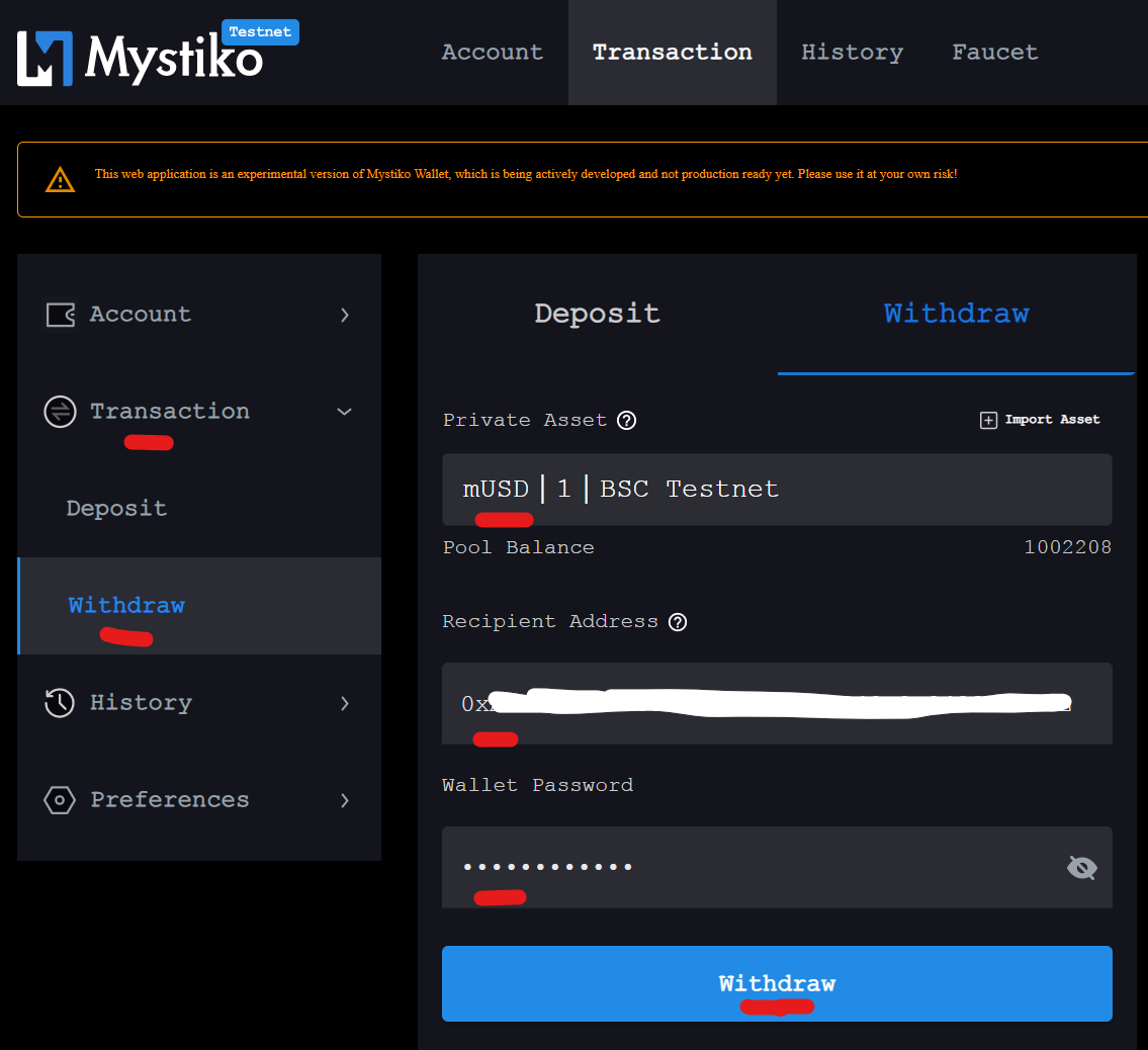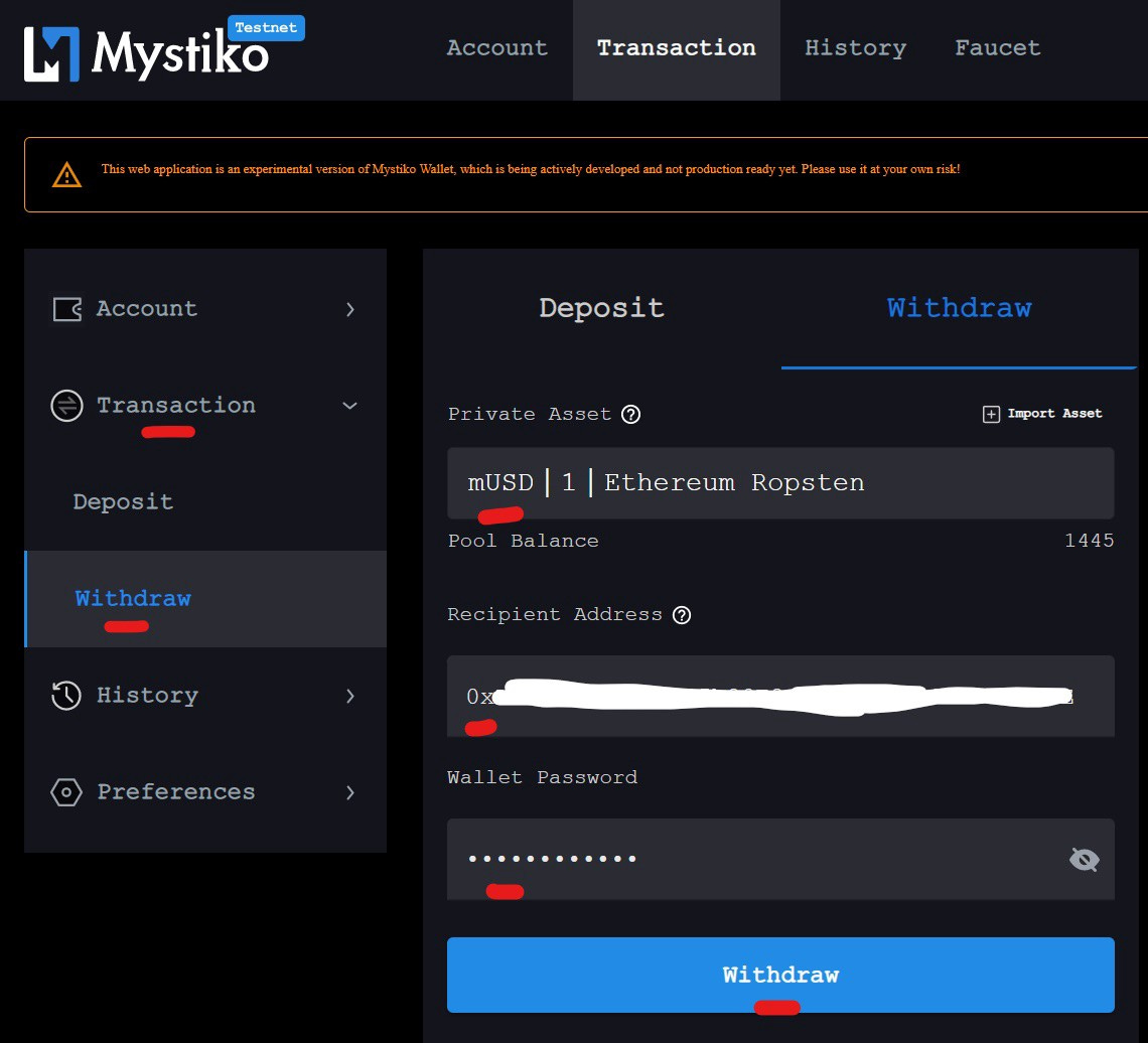 Go to “Transaction” then “Withdraw”. Choose the asset you are withdrawing. Enter another recipient address (starts with 0x, not Mystiko address) and password. Confirm.