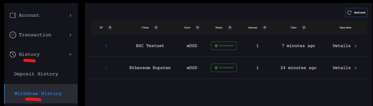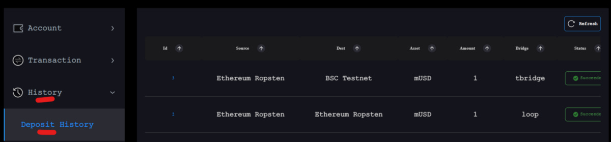 To confirm our transactions have gone through, go to “History” and then “Deposit History”. You should see both transactions with status as “Succeeded”.