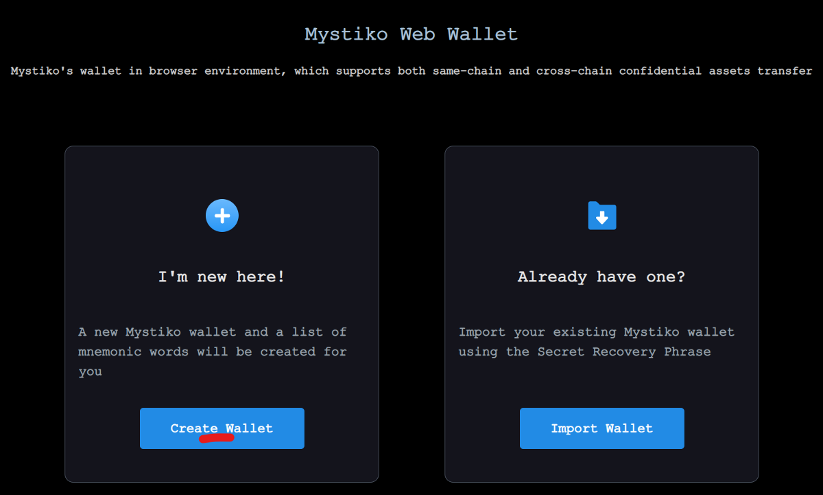 Go to https://testnet.wallet.mystiko.network/wallet and create your wallet.