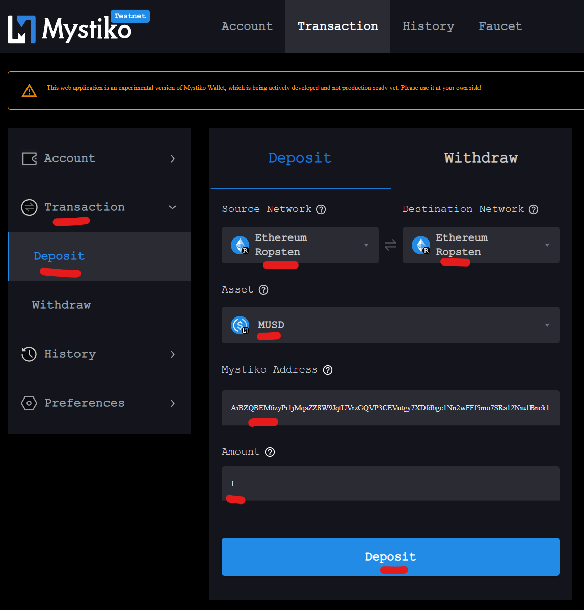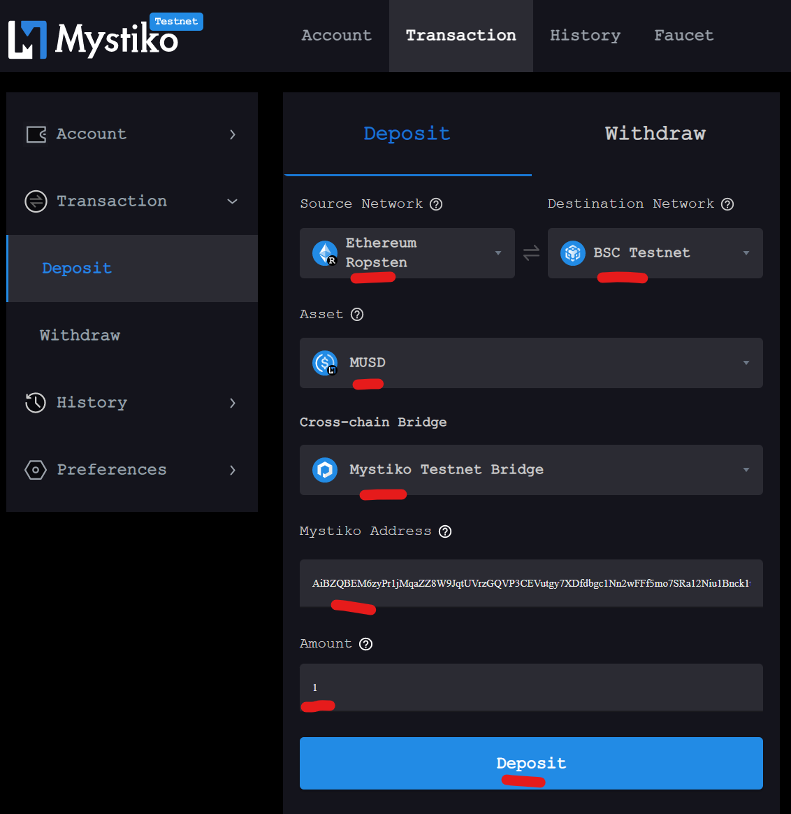 Go to “Transaction” and then “Deposit”. Choose your network, asset, address (the Mystiko account you just created) and amount. Confirm.