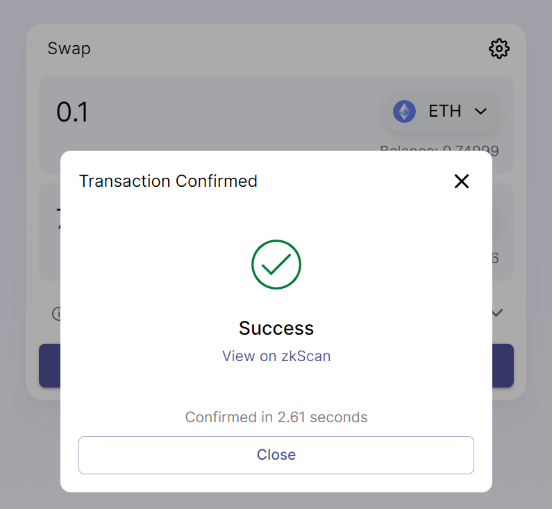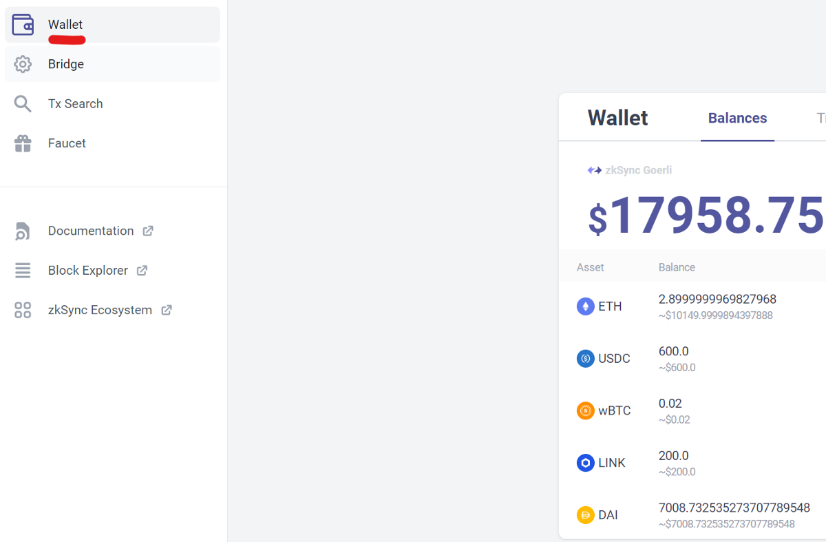 Switch your network back to ZkSync 2.0 and check your balance at “Wallet” to confirm the deposit has landed in your address.