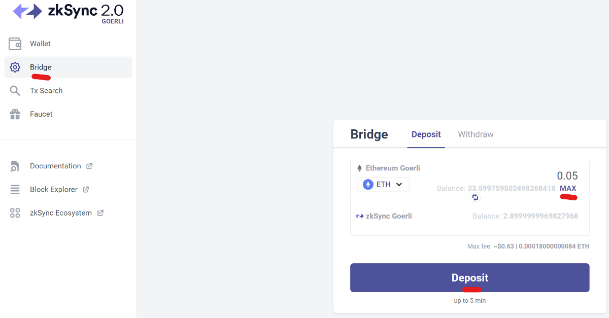 We then go to “Bridge” then “Deposit” to deposit some Goerli $ETH to zkSync 2.0. It will ask you to switch back to ETH Goerli testnet to finish the deposit.
